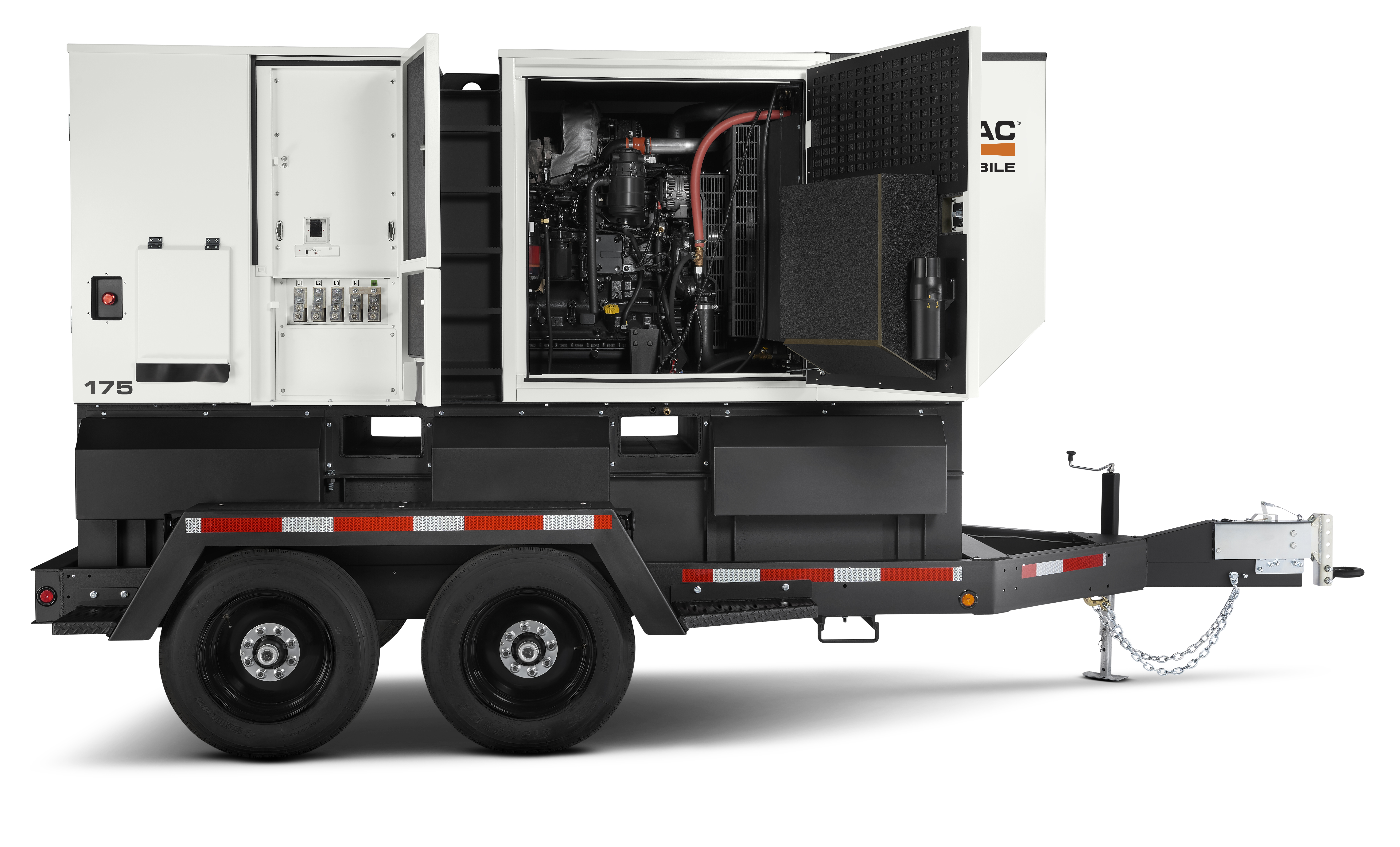 The MDG175DF4 mobile diesel generator delivers maximum performance and versatility. The turbocharged, 6-cylinder John Deere® Final Tier 4 engine is reliable and durable. Selective catalytic reduction (SCR) exhaust after-treatment limits harmful emissions and minimizes soot buildup. The aluminum, sound-attenuated enclosure provides quiet operation and is rust proof for a long-lasting, attractive appearance.