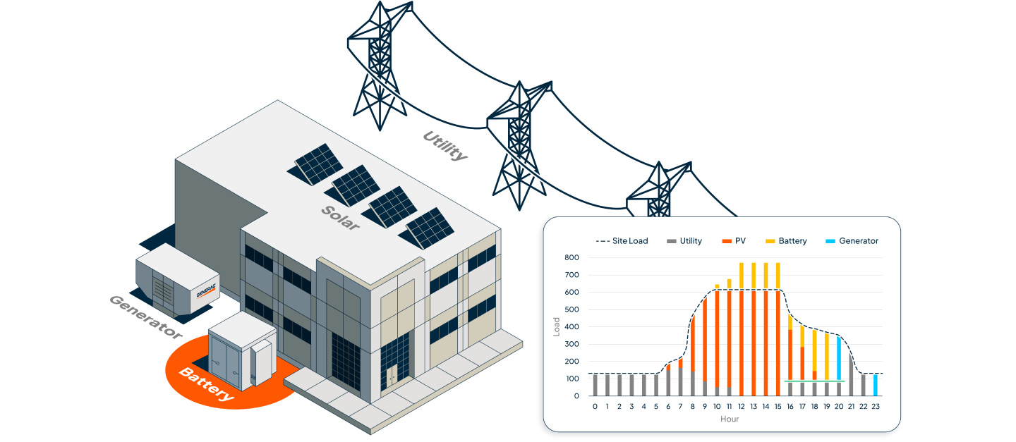 Your BESS stores excess energy to release when demand—and prices—are high. It’s an intelligent, responsive system that balances sources like solar PV panels or generators to optimize your energy usage and lower costs.