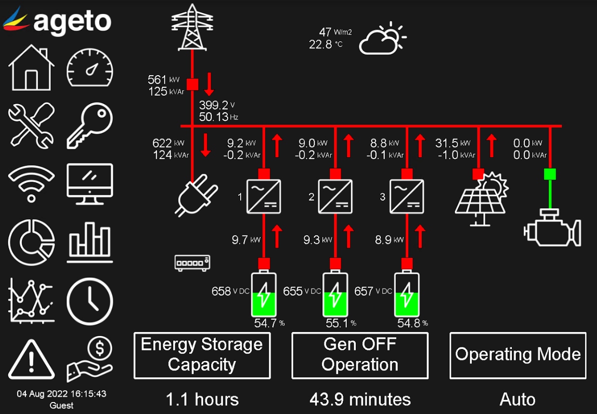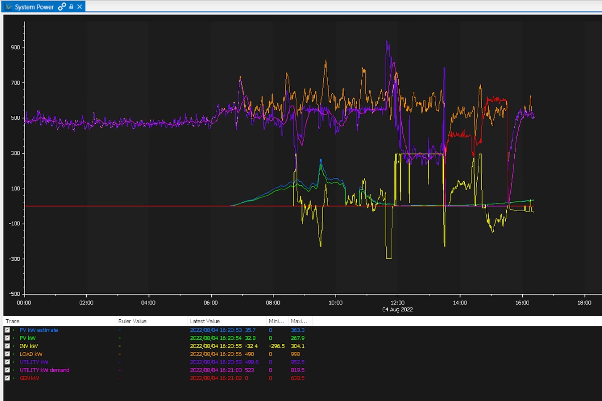 Adding storage is becoming an increasingly popular solution to solve issues faced by traditional generator and solar systems. This is true for this government building where 700 kW of solar and 3120 kW of generators previously existed without any storage. On sunny days, they were forced to curtail excess solar due to the zero export limit. During the frequent outages, when the generators were used to meet the load, cloud cover and fluctuating solar production resulted in repeated generator start/stops. This operation of the generators deteriorates their lifetime, increases maintenance needs and the risk of frequency imbalances. To learn more about the benefit of adding storage to a generator plant check out our blog post. Adding energy storage to an off-grid generator plant: is the complexity worth the headache?.
