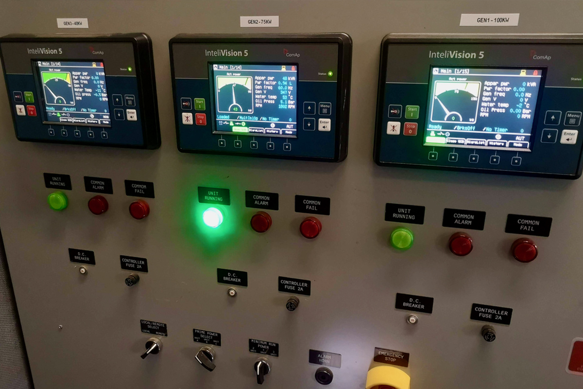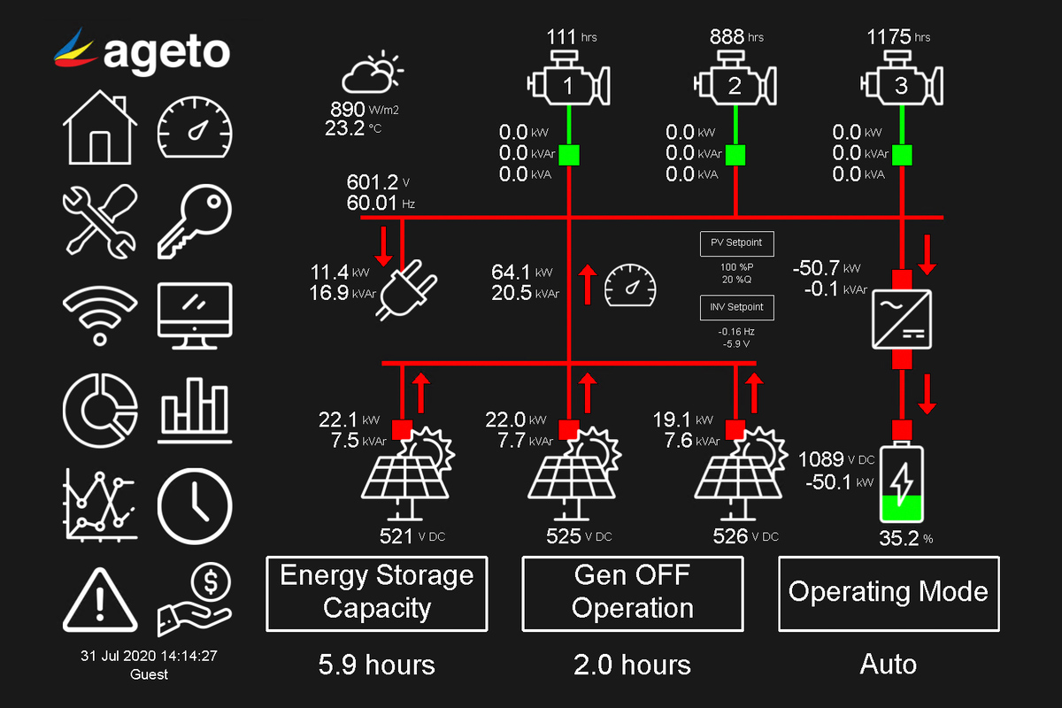 The Generac Renewable Controller is the microgrid controller coordinating and integrating the renewable energy resources into the larger power system. The site is designed to maximize renewable energy utilization including turning the diesel generators off and running on 100% renewable energy as conditions allow. The ARC microgrid controller provides minimum generator loading, allowing the PV solar and diesel generator to both be online at the same time. To reduce mode switching and provide multiple levels of redundancy, the generators and energy storage system work together utilizing droop to stabilize the power system.