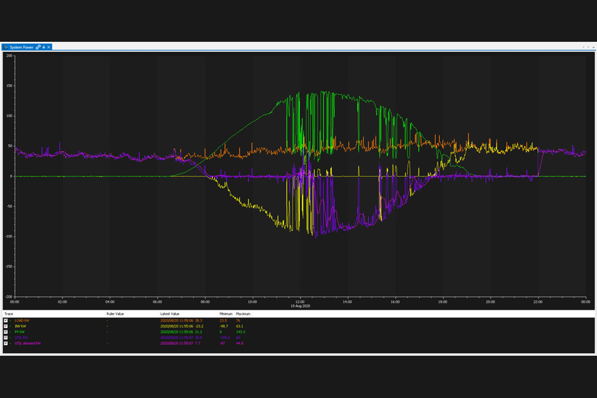 The Generac ARC microgrid controller is coordinating the charging of the Dynapower MPS-i125 energy storage systems with the PV solar production to increase the self-consumption of solar power. The controller also reserves a portion of the energy storage capacity to provide backup resilient power to the building during utility outages from storms or other utility faults.