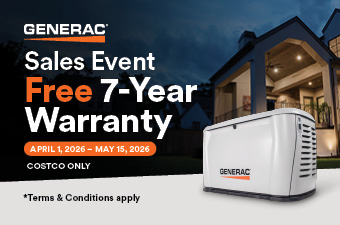 This promotion is only open to residents of the contiguous United States (excludes Puerto Rico and U.S. territories) and Canada. These promotional dates are exclusive to Costco customers. The only Generac Generators that qualify for this special promotion are air-cooled home standby generators 10kW – 28kW. For a complete list of qualifying model numbers, please visit www.Generac.com/National. Purchases must be made April 1, 2026 – May 15, 2026 at a participating Costco store. Void where prohibited, taxed or restricted by law. To qualify for the promotion, the Generac automatic home standby generator must be (1) a qualifying air-cooled home standby generator; (2) purchased within the promotion period at a participating Costco store and (3) installed and activated by July 26, 2026. The promotional offer is a free 7-year extended-limited warranty – a $735 US/$945 CAN value. Limit one per household. Warranty will be applied to generator at activation address, and will only be applied after the unit has been activated. Refurbished products are excluded from this promotion. Promotion redemptions must be electronically completed by 11:59 p.m. PST on July 26, 2026 via www.Gen erac.com/National. All redemptions are subject to Generac’s final review and approval. If a redemption is incomplete or fails to meet any of the terms and conditions, the promotional items will not be issued. Proof of purchase showing the qualifying purchase/signed contract date must be submitted to receive this offer. Generac recommends customers keep a copy of the requested forms for their r ecords. All submitted proofs of purchase become the property of Generac and will not be returned. Generac is not responsible for lost, late, or incomplete redemption forms. Please allow six to eight weeks for processing and an additional four to eight weeks to receive your free 7-year extended warranty certificate. This offer is not valid with any other Generac sponsored promotion. Generac reserves the right to rescind and/or change this offer at any time without notice. Additional terms and conditions may apply. For questions related to eligibility and the status of your promotional items, please visit www.Generac.com/National or call 1-855-388-3110 to speak with a Generac representative.